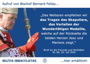 Da Gott seine Gnaden überaus freigebig anbietet, soll auch unsere Antwort großherzig ausfallen: 100.000 Ritter möchte die Priesterbruderschaft der Unbefleckten zu Füßen legen! Ritter, die motiviert sind, unter dem Banner Mariens zu streiten; die in diesem Jahr sich begeistert in die Botschaft von Fatima vertiefen, um den Willen der Königin noch besser zu erfassen und zu erfüllen. Mögen sich möglichst alle Gläubige entschließen, sich in die Militia Immaculatae, die Ritterschaft der Unbefleckten, aufnehmen zu lassen! Welch größere Ehre und Freude könnten wir dem unbefleckten Herzen erweisen?