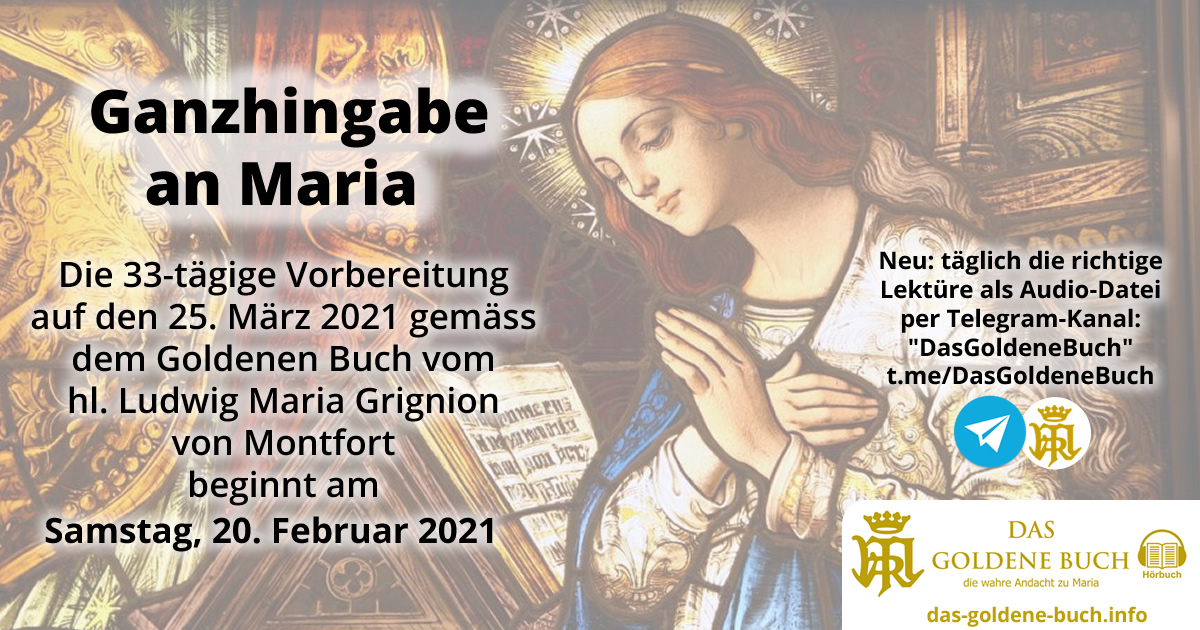 Wer die 33-tägige Vorbereitung für die Ganzhingabe an Maria am 25. März, dem Fest Mariä Verkündigung, durchführen möchte, sollte am Samstag, 20. Februar starten. Im Beitrag “Das Goldene Buch – neu als Online-Hörbuch” haben wir ausführlicher über das Goldene Buch berichtet.