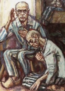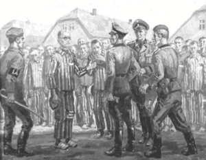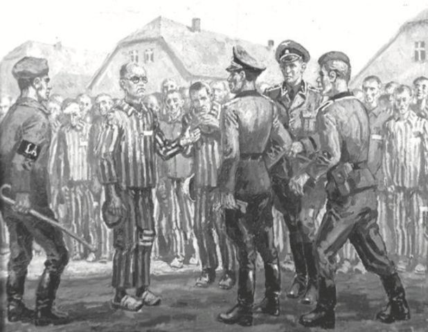… Er ging direkt auf die Gruppe der SS-Männer zu, die bei der ersten Reihe der Gefangenen stand. Alle erschauderten, denn das bedeutete den Bruch der Regel, auf der am meisten beharrt wurde und deren Zuwiderhandlung aufs Brutalste bestraft wurde. Das Verlassen der Reihe bedeutete den Tod … Wir waren sicher, dass sie Pater Maximilian töten würden, bevor er es geschafft hatte, zu ihnen zu gelangen. Aber es passierte etwas Außerordentliches … Nie konnte ein Gefangener die Reihe verlassen, ohne bestraft zu werden. Es war so unvorstellbar für die SS-Männer, dass sie ganz verdutzt dastanden. Sie schauten einander an und wussten nicht, was geschah.“