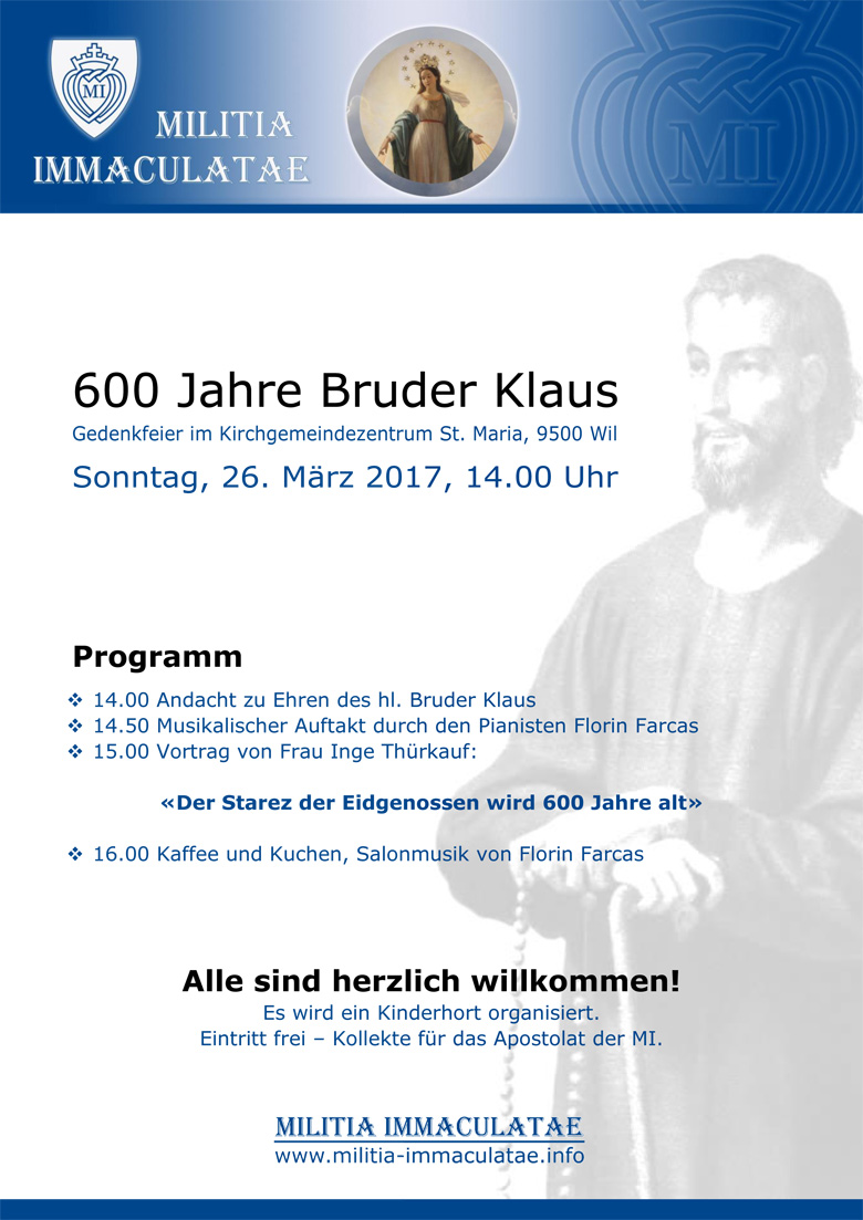 600 Jahre Bruder Klaus – Gedenkfeier im Kirchgemeindezentrum St. Maria, 9500 Wil – Sonntag, 26. März 2017, 14.00 Uhr –  Programm – 14.00 Andacht zu Ehren des hl. Bruder Klaus – 14.50 Musikalischer Auftakt durch den Pianisten Florin Farcas – 15.00 Vortrag von Frau Inge Thürkauf: «Der Starez der Eidgenossen wird 600 Jahre alt»