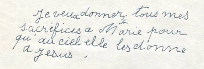 Handschrift der kleinen Anna: “Ich möchte Maria alle meine Opfer schenken, damit sie sie im Himmel an Jesus weitergibt.”