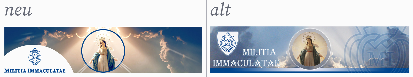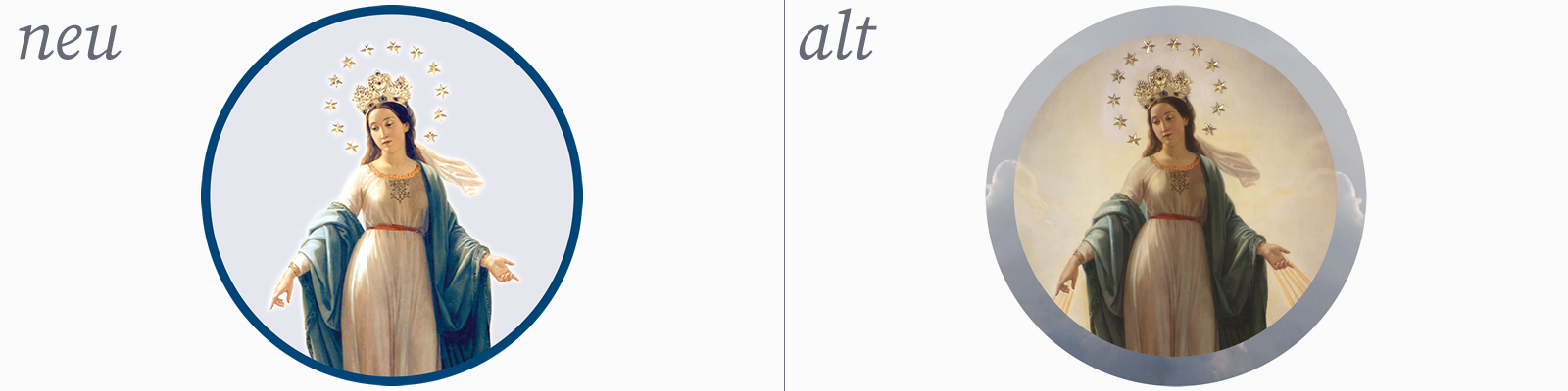 Das Immaculata Bild hat für die «Eingeweihten» eine längere Geschichte und große Bedeutung, wie Sie hier nachlesen können. Für Außenstehende wirkte das Bild tendenziell veraltet – von der Farbigkeit her vergilbt und die Kontraste etwas schwach, was der bläulich graue Rahmen noch verstärkte. Durch das Freistellen der Immaculata kann unsere Königin nun auf verschiedenen Hintergründen auch besser zum Vorschein kommen und durch die Auffrischung ihrer Farben in neuer Pracht erstrahlen, wie man sicherlich auch aufgrund des neuen Homepage-Banners erkennen kann.