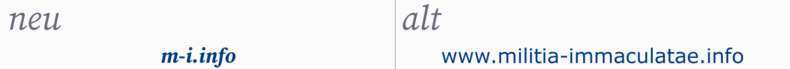 Der lange Domainname «militia-immaculatae.info» war anfällig für Tippfehler und gerade für Ausstehende kaum zu merken. Wir konnten vor wenigen Monaten durch Gottes Fügung den Domainname «m-i.info» günstig kaufen und werden nun primär nur noch diesen verwenden. Die Webseite wird seit einiger Zeit automatisch auf diese kurze Adresse umgeleitet. Auch die E-Mail-Adressen werden auf diese kurze Endung umgestellt.