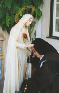 „Am 10. Dezember 1925 erschien ihr die allerseligste Jungfrau, und an ihrer Seite, auf einer leuchtenden Wolke, war das Jesuskind. Die heiligste Jungfrau legte ihre Hand auf ihre Schulter und zeigte ihr dabei ein von Dornen umgebenes Herz, das sie in der anderen Hand hielt. Gleichzeitig sagte das Kind: Erbarme dich des Herzens deiner heiligsten Mutter, das mit Dornen bedeckt ist, mit denen undankbare Menschen es jeden Augenblick durchbohren, und es gibt niemanden, der einen Akt der Wiedergutmachung vollbringt, um sie zu entfernen.