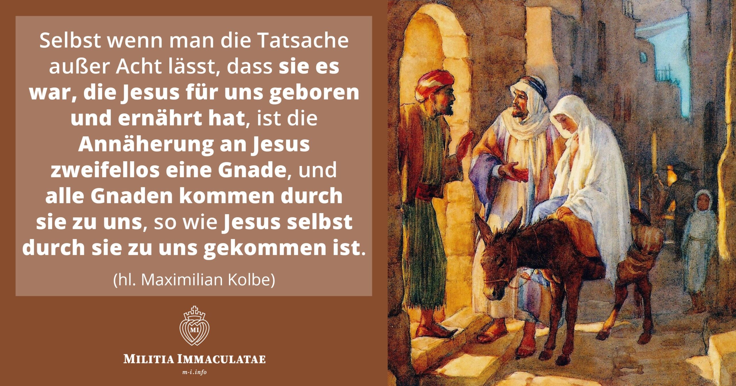 Drei Tagesreisen weit und beschwerlich war der Weg in rauher Winterszeit, den Maria und Josef geduldig und ergeben gingen. Wunderbare Erwägungen stiegen in ihrer Seele auf, je näher sie der Stadt Davids kamen. Auf den Gefilden, durch welche sie mühsam einherzogen, war einst eine Ahnfrau des Messias, die fromme Ruth, gewandert, hier hatte David seine Herden geweidet, von hier ward er zum Heerführer, zum König, berufen. Nun erschien sie, seine Tochter, der Zweig aus Jesses Stamm mit ihrer Himmelsblüte, aber arm und unbekannt. Als Fremdling klopft sie an die Türen in der Heimat und “es war kein Platz für sie in der Herberge”. Gott, der den Sinn des fernen Kaisers Augustus lenkte, um sie in dieser Stunde nach Bethlehem zu führen, er rührt auch nicht ein Herz in der ganzen Stadt, sie aufzunehmen. Erschöpft und müde irren Josef und Maria auf den Straßen, bis Dunkelheit eintritt. Ein ergreifendes Bild der Armut, der Demütigung, aber auch einer vollendeten Ergebenheit in Gottes Willen, die niemals irre wird an seiner Liebe, niemals erschüttert im rückhaltlosen Vertrauen.