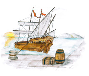 Am vereinbarten Abend ging der Ritter an Bord des Schiffes. Das Pferd blieb noch draußen am Ufer stehen und sollte erst später aufs Schiff geladen werden. Adalbert betrat seine Kabine und legte sich, müde geworden von all den Aufregungen, zur Ruhe. Als Soldat war er es gewohnt, auch im Schlaf wachsam zu bleiben und auf jedes Geräusch zu reagieren. So erwachte er sofort, als er hörte, wie die Tür zur Kabine leise knarzend geöffnet wurde. „Er schläft“, hörte er ein leises Kichern. Gleich standen einige Gestalten in seiner Kabine, er erkannte den Kapitän des Schiffes und den Steuermann. „Sollen wir ihm gleich die Gurgel durchschneiden und ihn dann ausrauben?“ fragte letzterer. „Nein, nein, das machen wir erst auf dem Meer, da können wir die Leiche einfach über Bord werfen. Aber das Gold brauchen wir jetzt schon, wenn wir heute Abend noch ins Wirtshaus gehen wollen. Also los, alles durchsuchen!“ „Haha, hab schon was!“ triumphierte der Steuermann und hielt ein leise klingendes Säckchen in der Hand. Doch da hatte er nicht mit unserem Ritter gerechnet, der einstweilen heimlich nach seinen Waffen gegriffen hatte und nun plötzlich aufsprang. „Gebt mir sofort meinen Beutel zurück!“ „He, holla! Unser Passagier will streiten! Das kann er haben“, rief der Kapitän, und mit einem Pfiff rief er die bewaffnete Mannschaft herbei. Hei, das gab eine Schlacht! Unser Ritter focht tapfer, doch die Übermacht war zu groß. Schließlich gelang es ihm, sich ans Deck des Schiffes durchzuschlagen. Immerzu fechtend und die Hiebe der Piraten abwehrend drang er bis zur Reling durch und sprang ans Ufer. Mit einem Schwerthieb war das Tau seines Pferdes gelöst. Er sprang auf den Rücken seines treuen Tieres, teilte noch ein paar heftige Hiebe auf seine Gegner aus und jagte dann davon. Das Gold war verloren, ebenso Lanze und Schild, doch Leben, Pferd und Schwert gerettet.