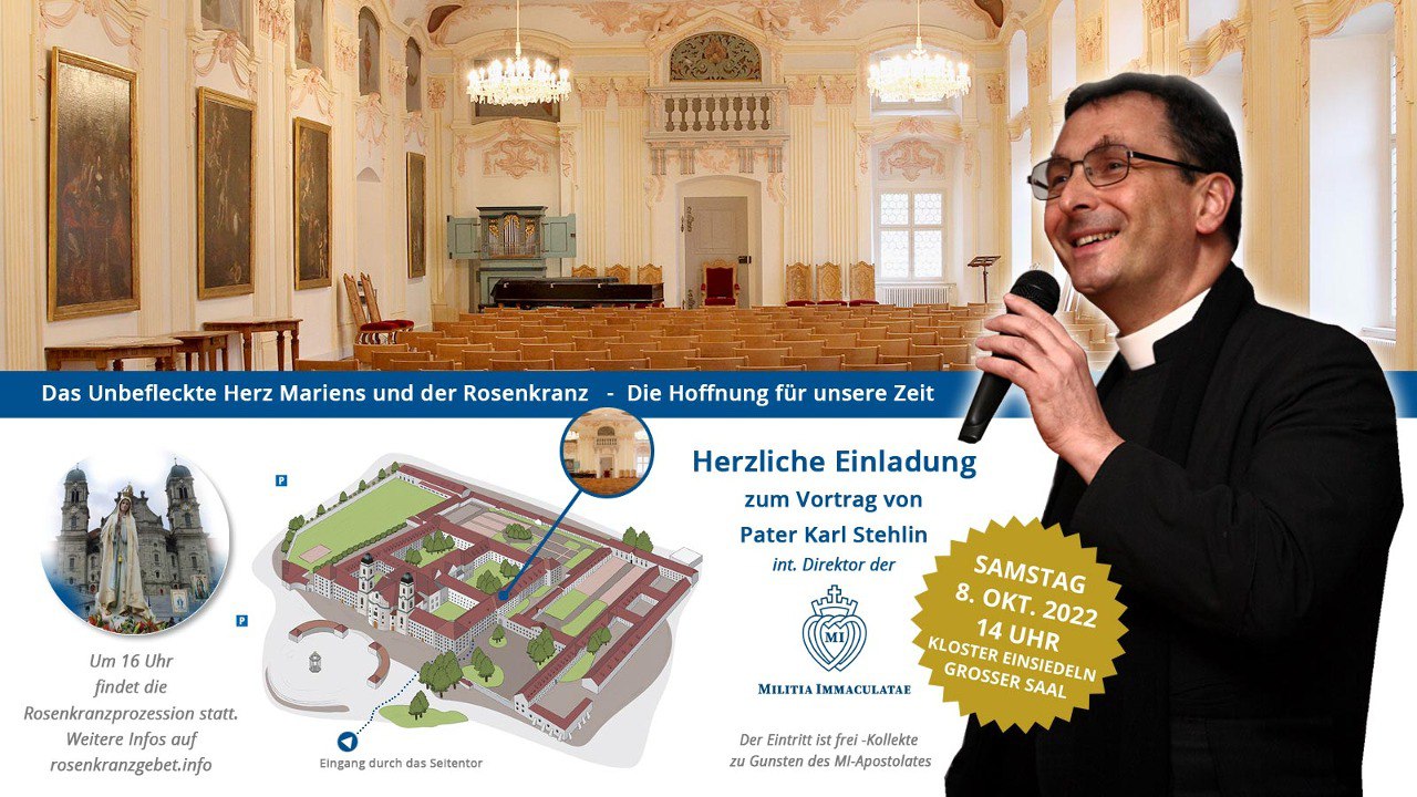 Es freut uns, Pater Karl Stehlin, den internationalen Direktor der MI, anlässlich der Rosenkranzprozession (siehe hier) zu einem Besuch in der Schweiz begrüssen zu dürfen. Vor der Rosenkranzprozession wird er um 14 Uhr im schönen Barocksaal des Klosters Einsiedeln einen Vortrag halten. Dabei wird er passend zum Thema der Prozession über das Unbefleckte Herz Mariens und den Rosenkranz sprechen. In einer Zeit, in der sich viele Menschen Sorgen um die Zukunft machen und erfahren, wie der Teufel seine Angriffe immer mehr steigert, ist es wichtig, genau zu wissen, wohin wir uns wenden können.