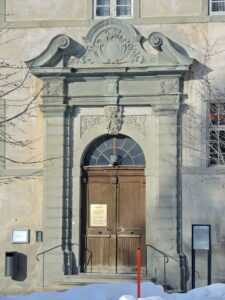 Der Eingang zum grossen Saal befindet sich rechts von der Kirche über die Hofpforte. Siehe Übersichtsplan auf den Bild.