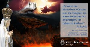 In Fatima wird uns aufgezeigt, dass nur das Unbefleckte Herz Mariens uns als letztes Angebot Gottes vor diesem dreifachen Unheil retten kann. An uns ist es, uns ganz auf die Seite der Immaculata zu stellen und unter ihrem Schutz zu beten, zu opfern, die Herz-Mariä-Andacht und das Rosenkranzgebet mit den inhaltsreichen Bitten ‚O mein Jesus, verzeih uns unsere Sünden…‘ eifrig zu üben und als Apostel Mariens zu wirken.