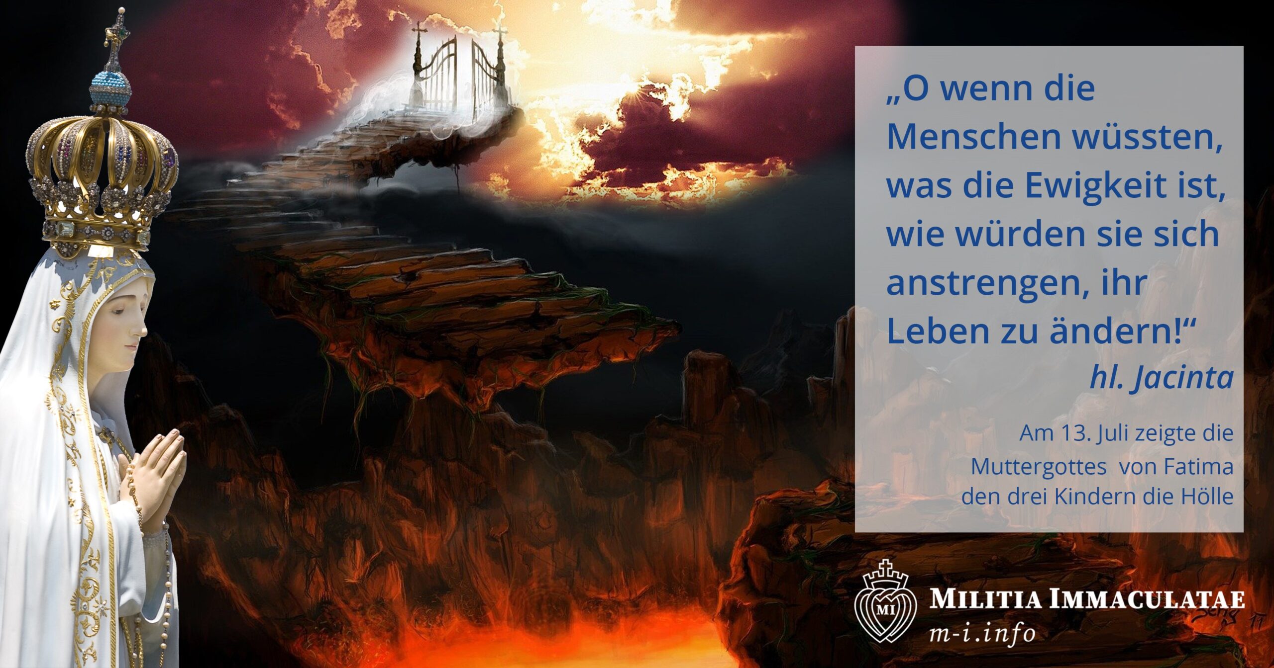„Ihr habt die Hölle gesehen, wohin die Seelen der armen Sünder kommen. Um sie zu retten, will Gott die Andacht zu meinem Unbefleckten Herzen in der Welt begründen. Wenn man tut, was ich euch sage, werden viele Seelen gerettet werden und es wird Friede sein. Der Krieg geht seinem Ende entgegen.