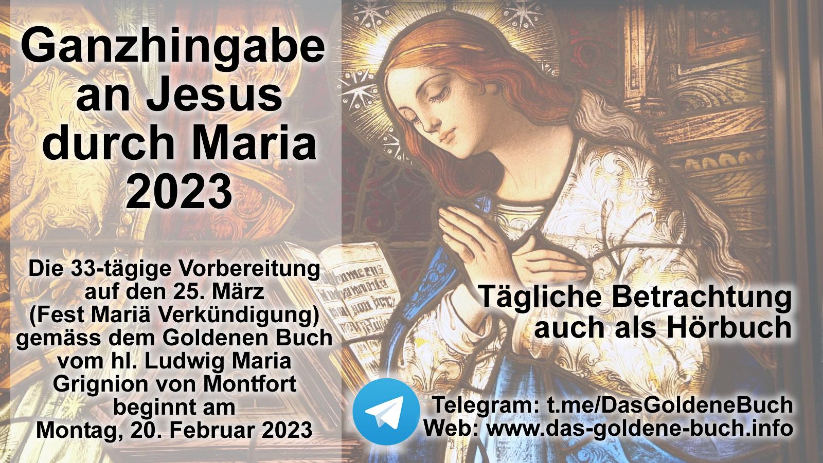 Wer die 33-tägige Vorbereitung für die Ganzhingabe an Jesus durch Maria am 25. März, dem Fest Mariä Verkündigung, durchführen möchte, sollte am Montag, 20. Februar starten. Weiter unten sowie auf der Webseite das-goldene-buch.info, finden Sie weitere Informationen über das Buch, das der heilige Ludwig Maria Grignion von Montfort wohl für unsere Zeit geschrieben hat.