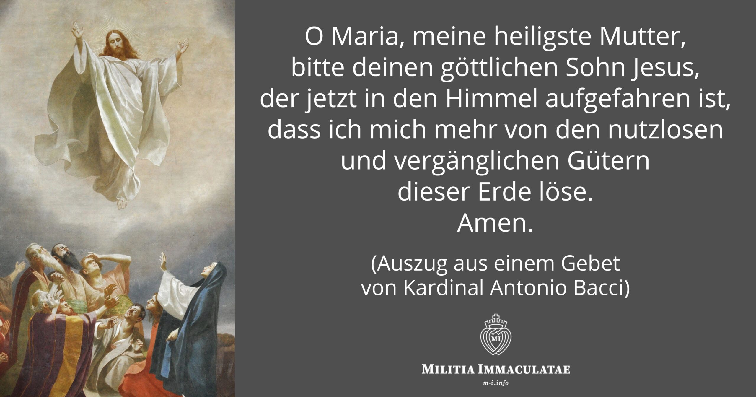 O Maria, meine heiligste Mutter, bitte deinen göttlichen Sohn Jesus, der jetzt in den Himmel aufgefahren ist, dass ich mich mehr von den nutzlosen und vergänglichen Gütern dieser Erde löse.