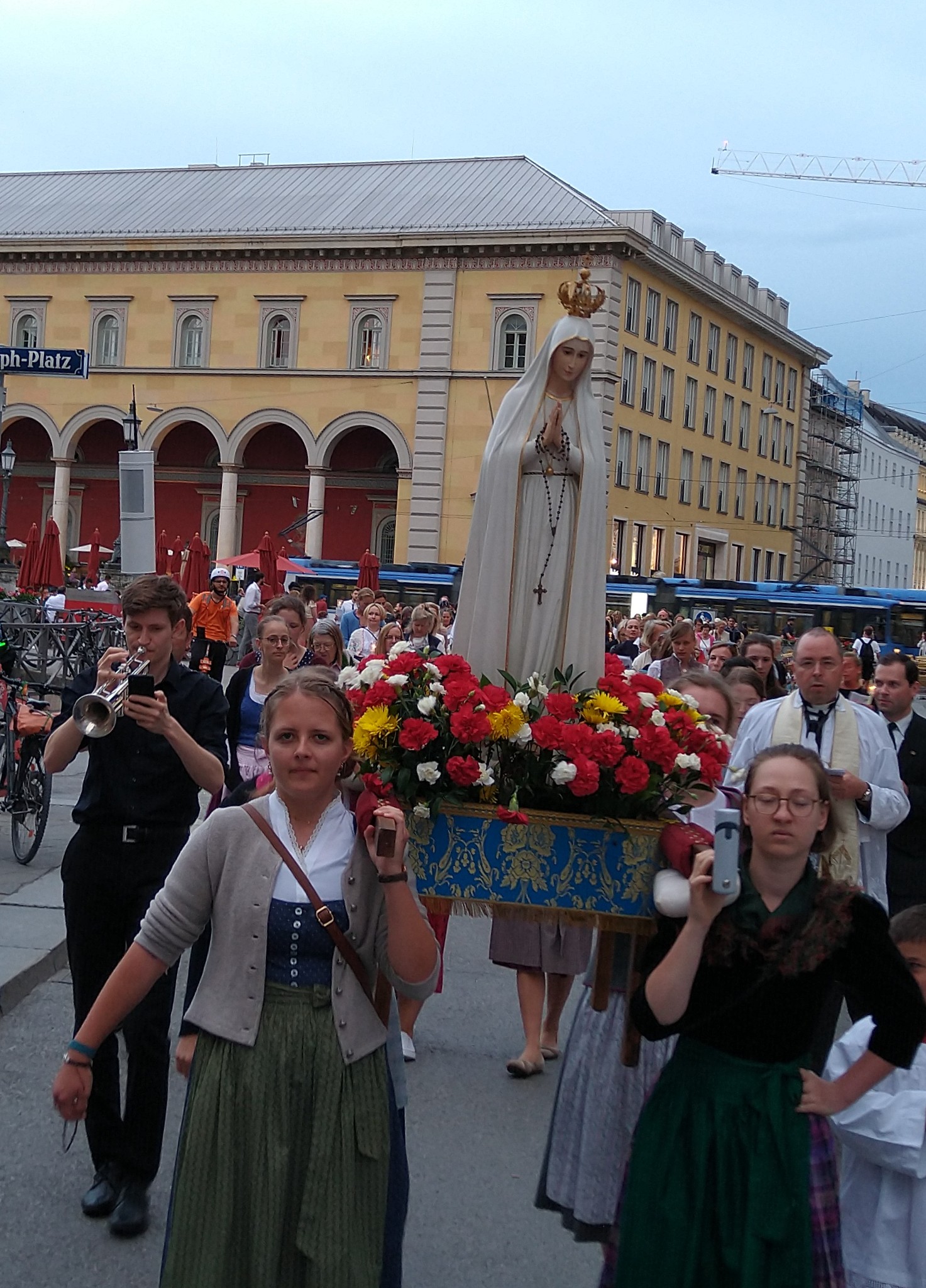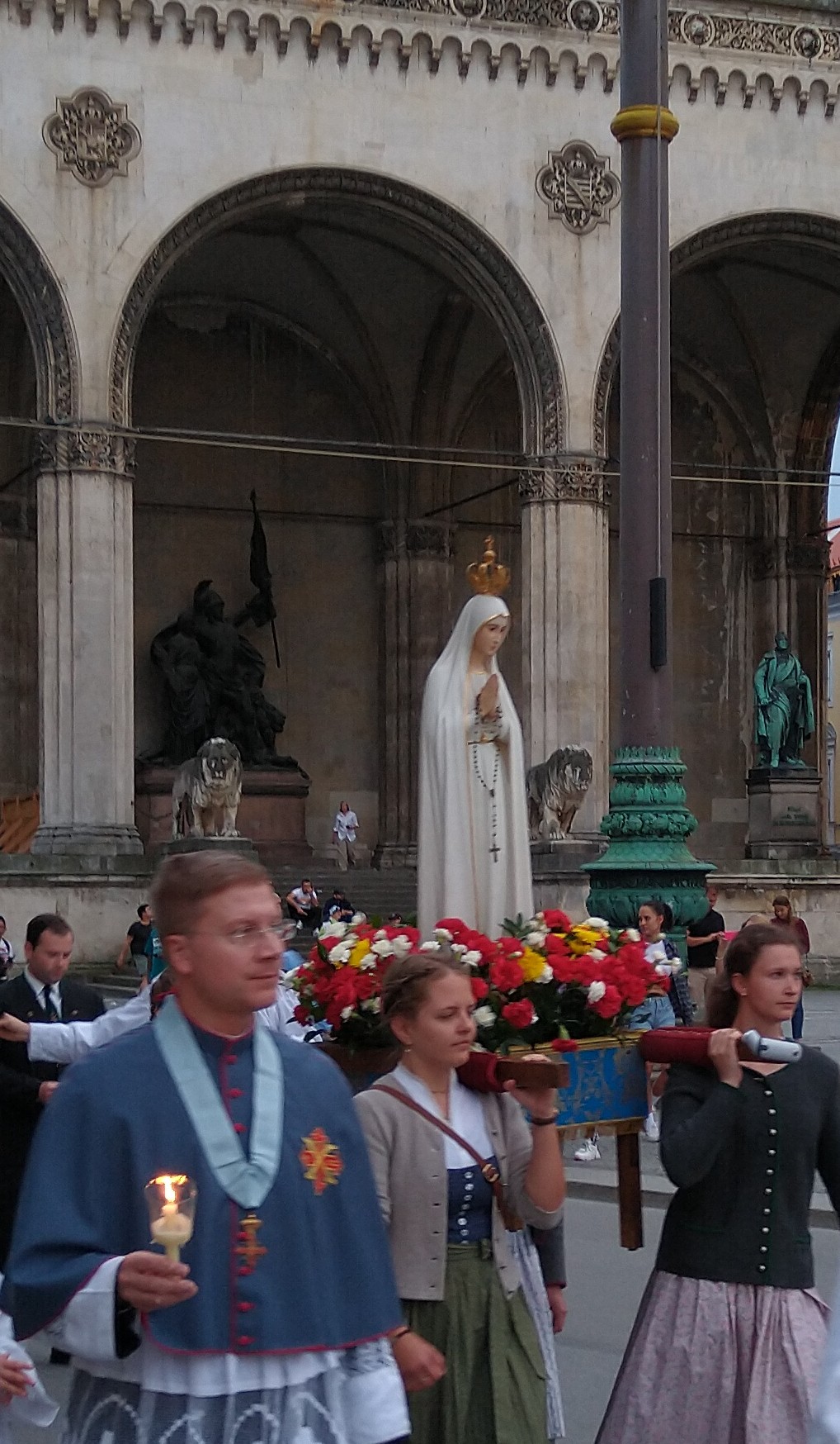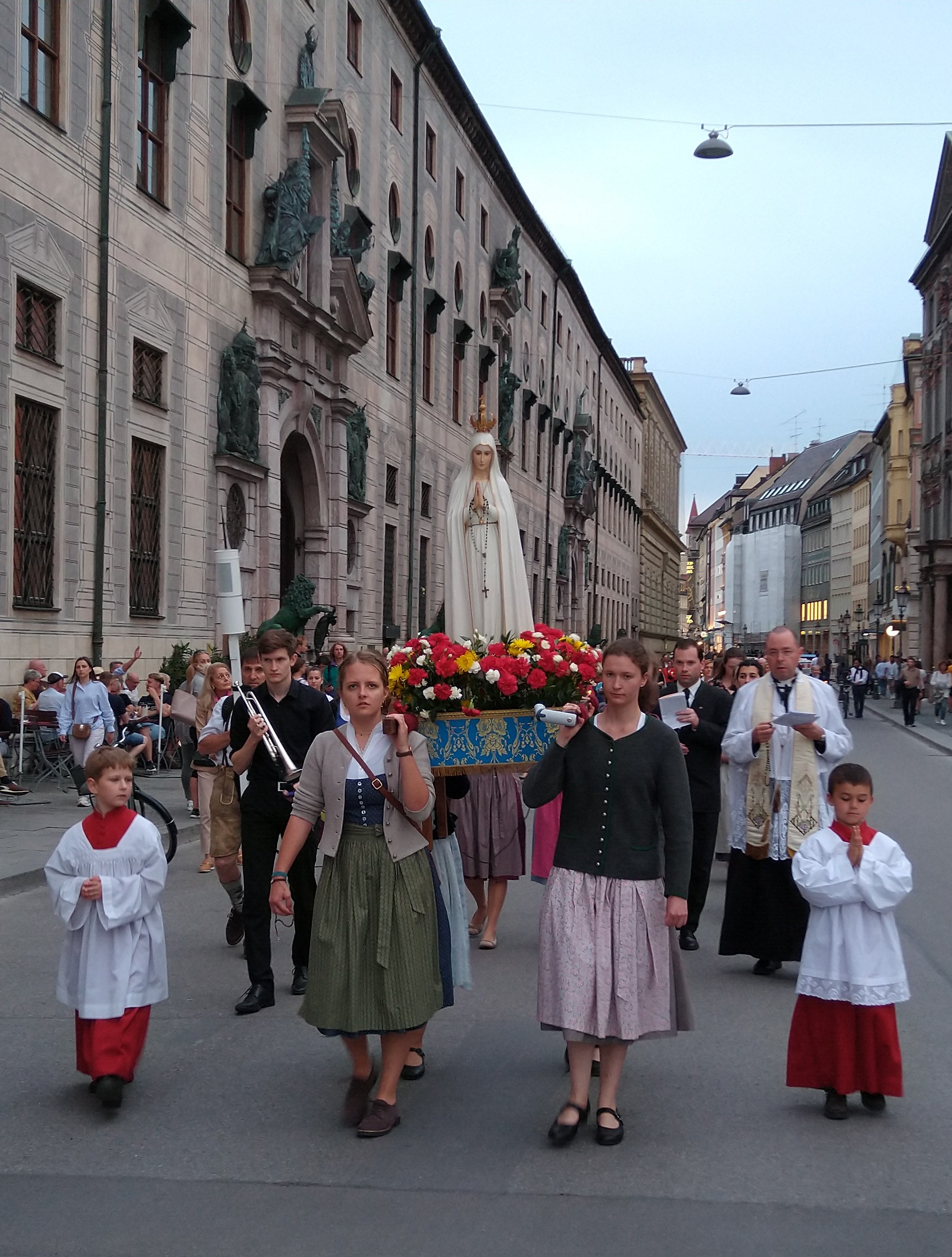 Die anschließende Prozession wurde angeführt von Kreuz und Ministranten, verschiedene Fahnen, es folgten viele Menschen allen Alters – meist in der bayrischen Tracht bekleidet – und in der Mitte des Prozessionszuges eine mit Blumen geschmückte Fatima-Statue auf einer Trage. Die Menschen hielten brennende Kerzen in der Hand, beteten den Rosenkranz und sagen von Trompetenmusik begleitet Marienlieder. Der Prozessionszug ging vom Marienplatz über die schönen Münchner Straßen zum Odeonsplatz mit der schönen Theatinerkirche und von dort wieder zurück. Unterwegs wurden Wundertätige Medaillen an die Passenten verteilt, viele von diesen waren von der Prozession offensichtlich berührt.
