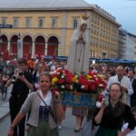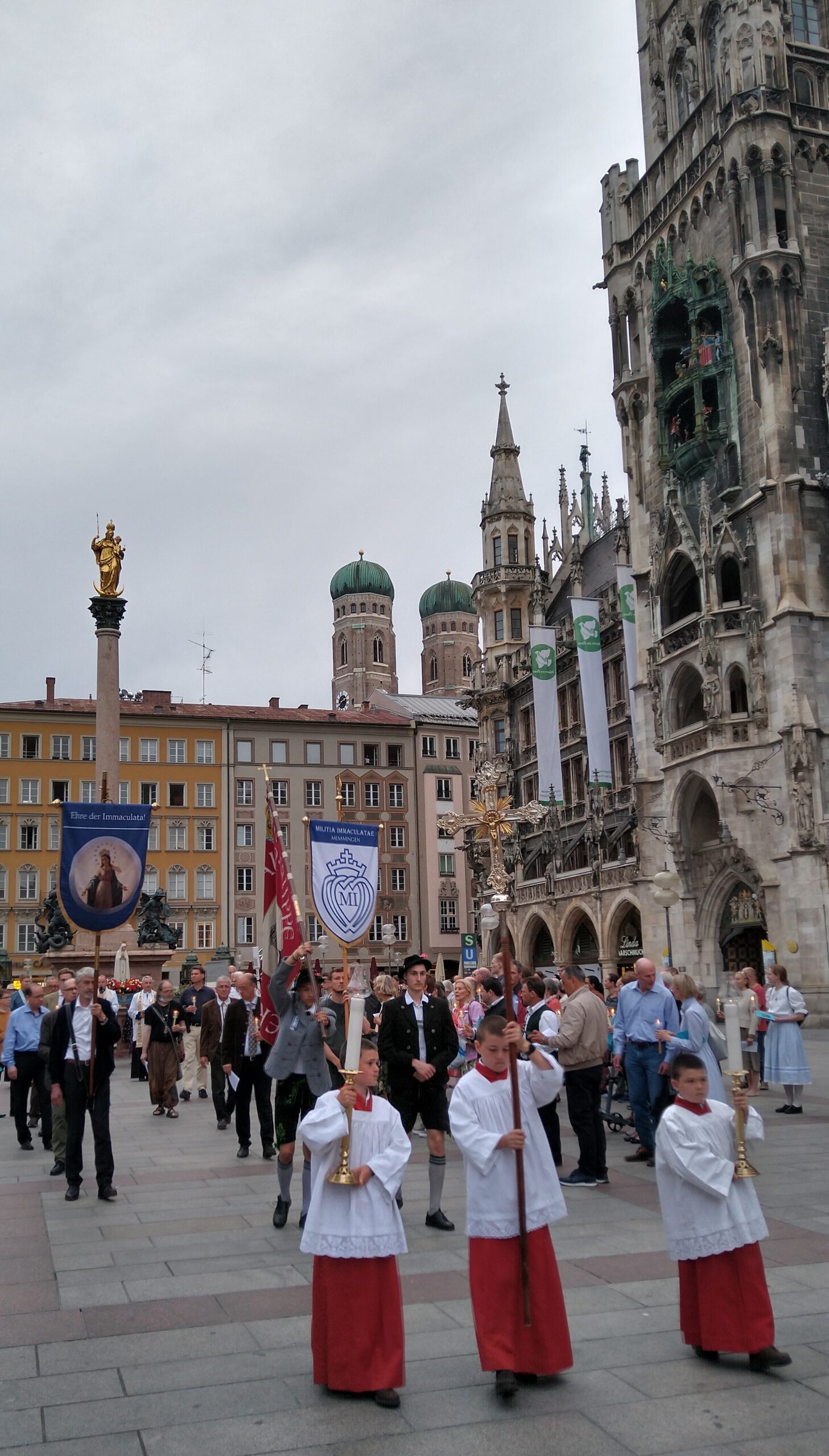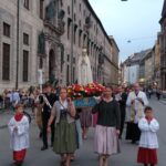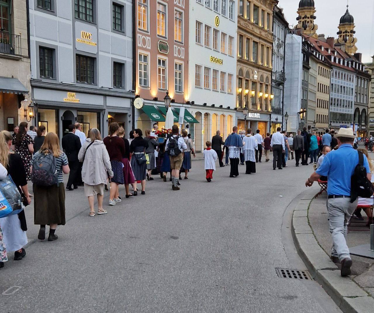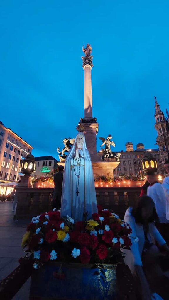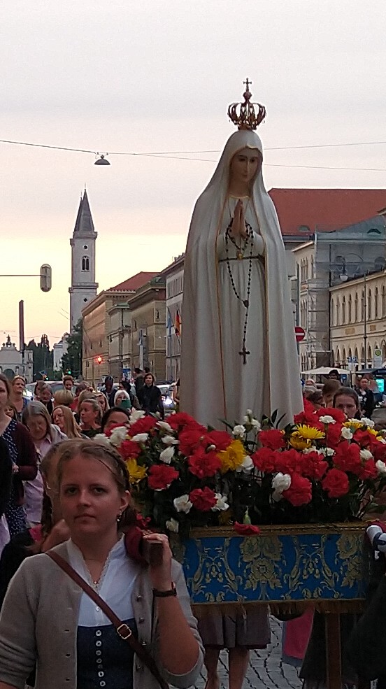 Die anschließende Prozession wurde angeführt von Kreuz und Ministranten, verschiedene Fahnen, es folgten viele Menschen allen Alters – meist in der bayrischen Tracht bekleidet – und in der Mitte des Prozessionszuges eine mit Blumen geschmückte Fatima-Statue auf einer Trage. Die Menschen hielten brennende Kerzen in der Hand, beteten den Rosenkranz und sagen von Trompetenmusik begleitet Marienlieder. Der Prozessionszug ging vom Marienplatz über die schönen Münchner Straßen zum Odeonsplatz mit der schönen Theatinerkirche und von dort wieder zurück. Unterwegs wurden Wundertätige Medaillen an die Passenten verteilt, viele von diesen waren von der Prozession offensichtlich berührt.