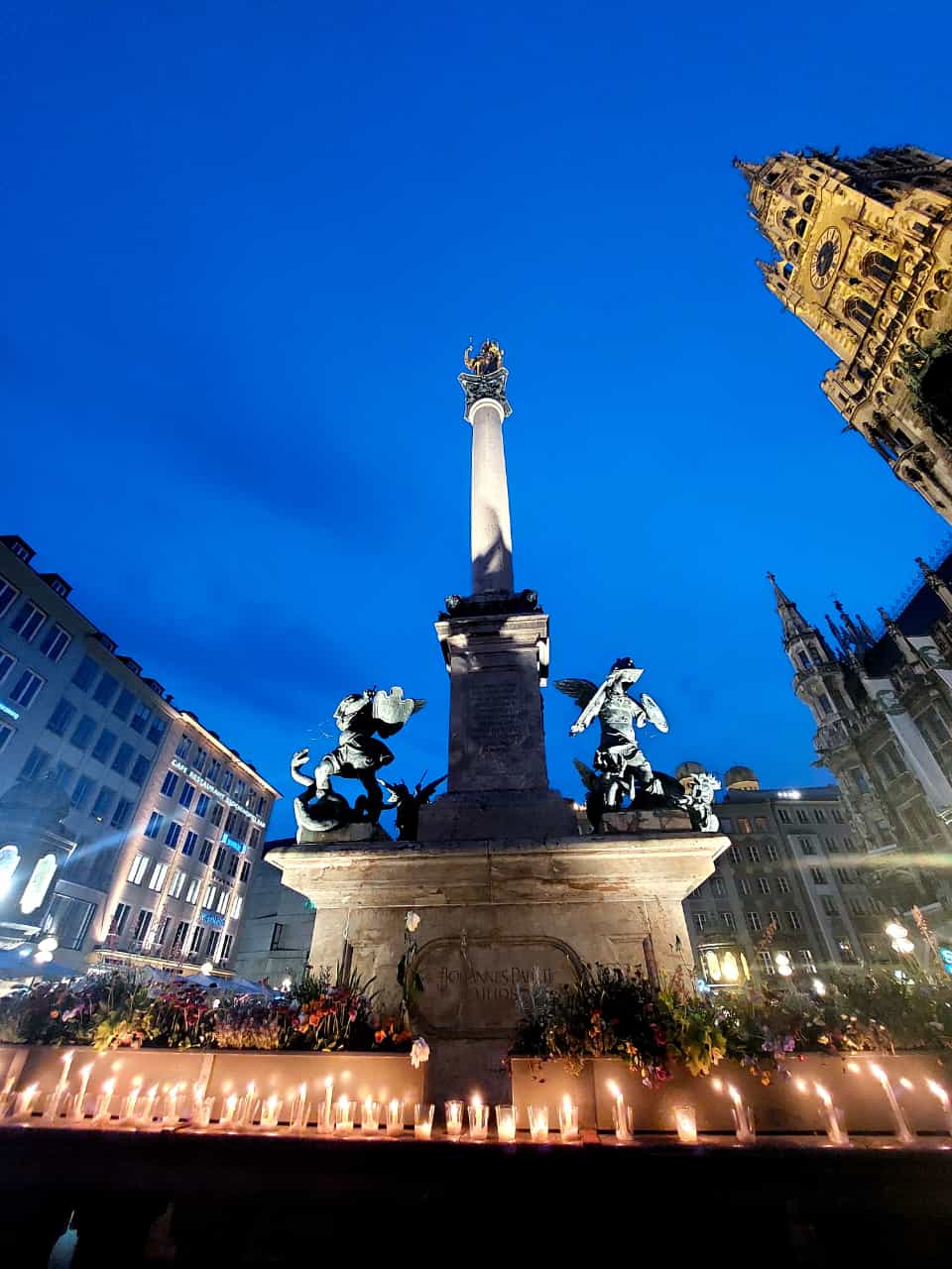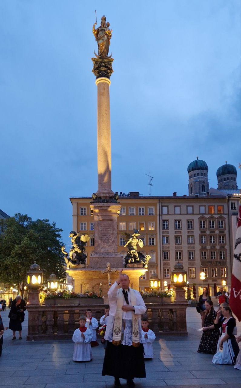 Startpunkt war um 19.45 Uhr bei der Mariensäule in München. Pater Helmut Trutt legte anhand eines schönen Zitates von Kardinal József Mindszenty (+1975) über seine Mutter dar, welch hohes Ideal und wichtige Rolle eine Mutter ist und rief dazu auf, dieses Ideal in der Gesellschaft hochzuhalten. Gerade in der aktuellen Gesellschaft wird vor allem das Schöne der Mutterschaft bedrängt und angegriffen. Jede Mutter sei zu ehren; Jesus wünsche das Lob seiner eigenen Mutter durch die Menschheit und dieses drücke sich ganz besonders durch das Rosenkranzgebet aus, so der Pater weiter.