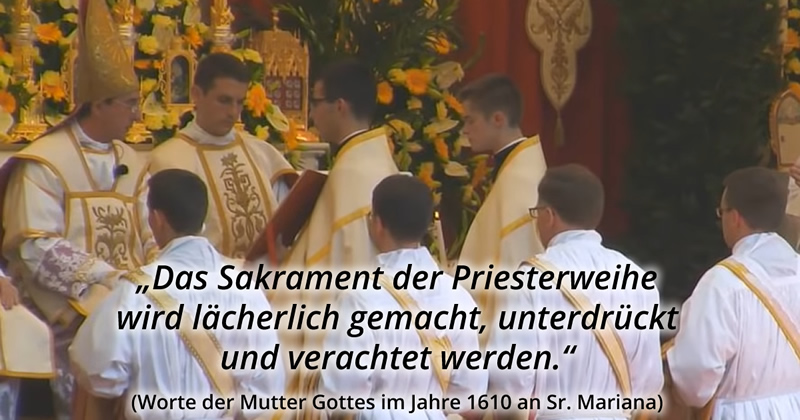 Am 21. Januar 1610 warnte die Heiligste Maria: „Ich lasse dir wissen, dass im 19. und fast der Hälfte des 20. Jahrhunderts im Land die Leidenschaften auftauchen werden und es wird eine totale Korruption der Sitten geben. Satan wird fast vollständig durch die Freimaurerei herrschen. Sie werden sich vor allem auf die Kinder konzentrieren, denn so bleibt die allgemeine Korruption bestehen. Es wird sehr schwierig sein, das Sakrament der Taufe und auch das Sakrament der Firmung zu empfangen. Ständig werden die Feinde Jesu Christi durch teuflische Anstiftung konsekrierte Hostien aus den Kirchen stehlen, um die eucharistischen Gaben zu entweihen. Und was das Sakrament der Ehe betrifft, so wird es angegriffen und zutiefst entweiht … der katholische Geist wird rasch verunreinigt, die kostbare Flamme des Glaubens wird nach und nach erlöschen … Dazu kommen die Auswirkungen der weltlichen Erziehung, die einer der Hauptgründe für den Mangel an Priester- und Ordensberufungen ist. Das Sakrament der Priesterweihe wird lächerlich gemacht, unterdrückt und verachtet werden. Der Teufel wird versuchen, die Diener des Herrn auf jede erdenkliche Weise zu verfolgen, er wird mit grausamer und subtiler Scharfsinnigkeit arbeiten, um sie vom Geist ihrer Berufung abzulenken, und er wird viele von ihnen verderben. Diese verderbten Priester, werden ein Skandal für das Volk sein und werden dazu führen, dass der Hass der schlechten Katholiken und die Feinde der katholischen, apostolischen und römischen Kirche auf den gesamten Klerus zurückfallen wird. Dieser vermeintliche Sieg Satans wird den guten Hirten der Kirche grosses Leiden bringen… In diesen unglücklichen Zeiten wird es einen ungezügelten Luxus geben, der den Rest in der Sünde gefangen hält und unzählige leichtsinnige Seelen erobert, die verloren gehen werden. Unschuld wird man nicht mehr bei Kindern finden, noch Bescheidenheit bei Frauen. In dieser grossen Not der Kirche werden die, die sprechen müssen, schweigen“.