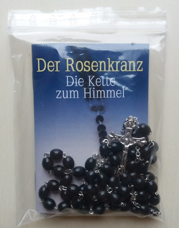 Zu diesem Zweck werden wir ab Ostern ein neues Set verbreiten. Dieses wird einen schönen, bereits gesegneten Rosenkranz und eine Broschüre mit einer Einführung in das Rosenkranzgebet und den 15 Geheimnissen enthalten. Diese Sets können die Ritter dann verschenken mit dem Ziel, dass wieder mehr Leute zu beten beginnen und dieses letzte Rettungsmittel kennen und nutzen lernen. Sie werden allen Rittern und auch den Prioraten und Kapellen kostenlos bzw. gegen freie Spende zur Verfügung stehen.