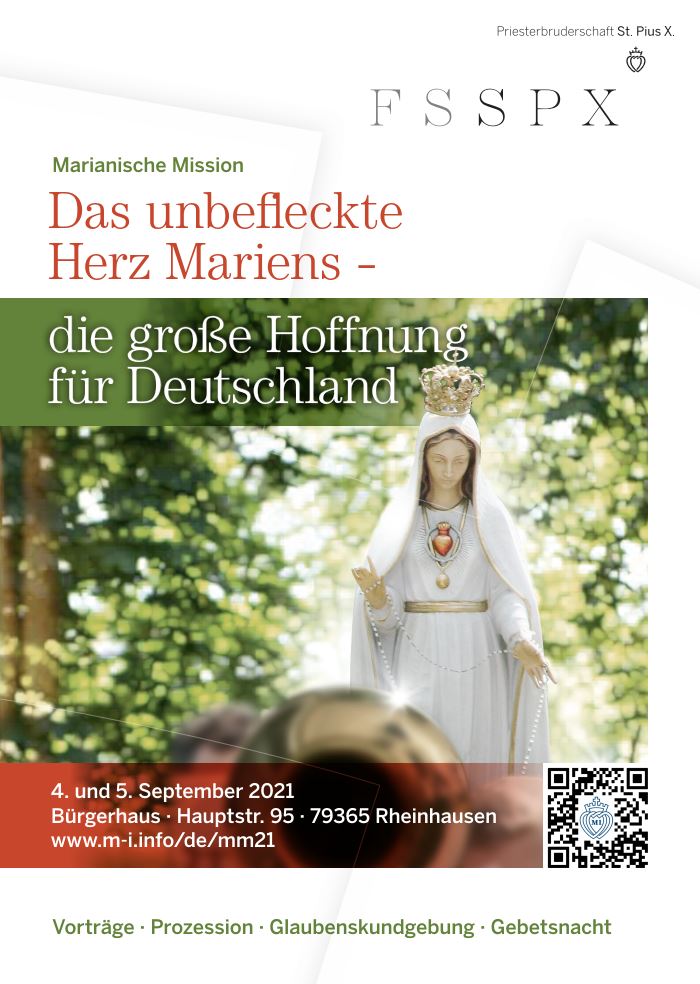 Am Wochenende vom 4./5. September findet in Rheinhausen (Deutschland, BW) unter der Leitung von Pater Karl Stehlin eine Marianische Mission statt zum Thema: “Das unbefleckte Herz Mariens – die große Hoffnung für Deutschland”. Es handelt sich um feierliche Tage mit Vorträgen, Prozession, Glaubenskundgebung und Gebetsnacht.