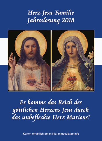 Ab sofort können bei uns die neuen Losungskarten für die Herz-Jesu-Familien bestellt werden. Die Jahreslosung lautet „Es komme das Reich des göttlichen Herzens Jesu durch das unbefleckte Herz Mariens!“. Auf der Rückseite der Karte sind die allgemeinen Gebetsintentionen der Herz-Jesus-Familie abgedruckt.