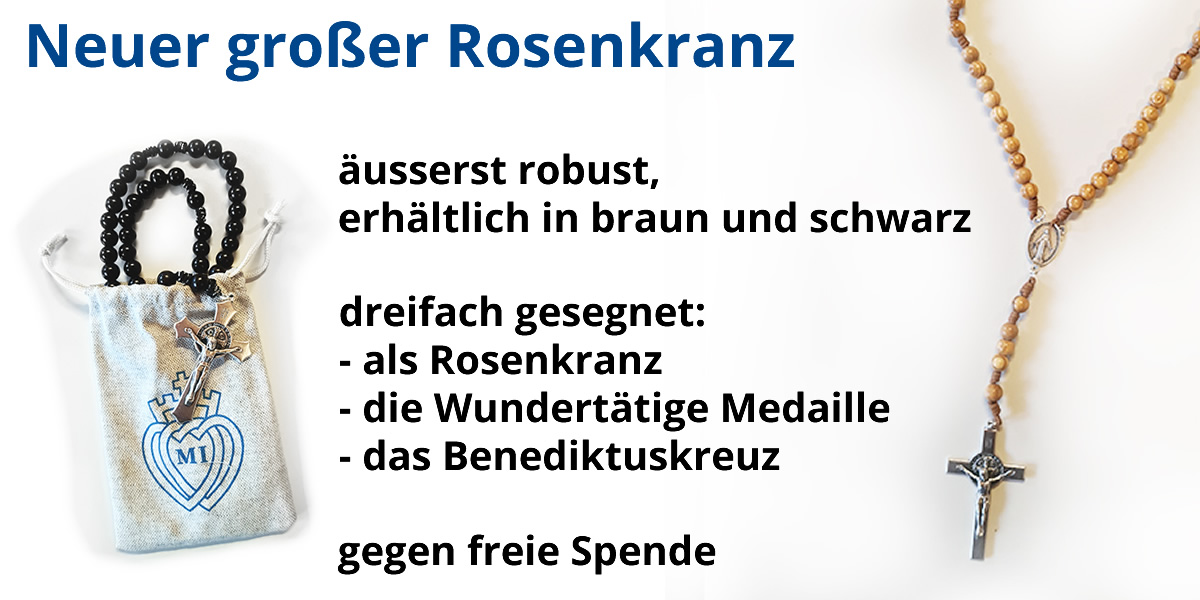 Unsere bisherigen großen Ritter-Rosenkränze (Spezialanfertigung für die MI, 48cm lang) wurden nochmals optimiert. So gibt es neu in der Mitte eine Wundertätige Medaille. Zudem waren diese bisher den MI-Mitgliedern (Rittern) vorenthalten, können nun aber frei bestellt werden.