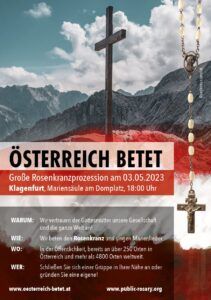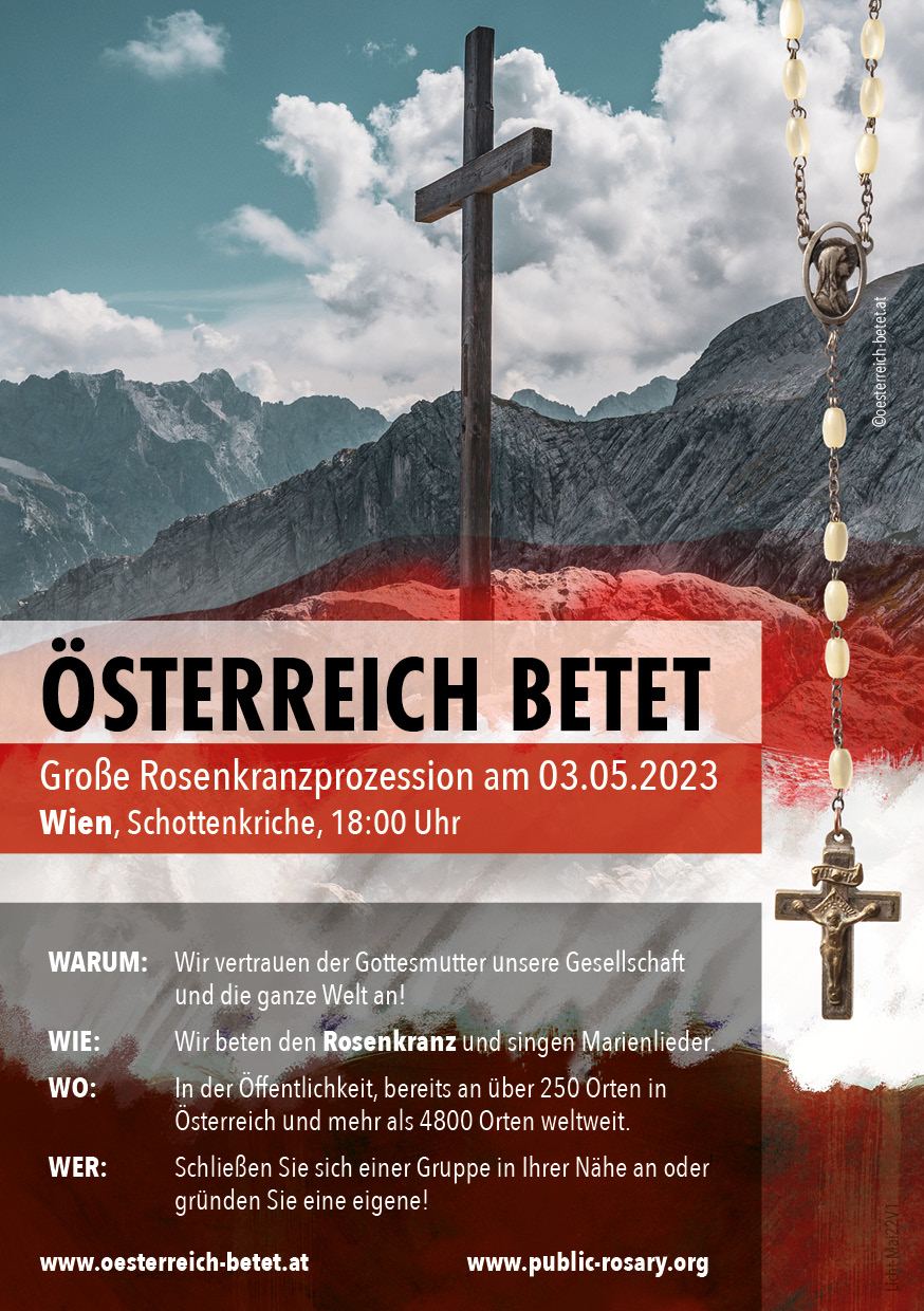 In Wien, Graz, Linz, Salzburg, Innsbruck, Klagenfurt, St. Pölten, Lienz finden am Mittwoch 3. Mai 2023 am Abend Rosenkranzprozessionen statt, organisiert durch die Aktion “Österreich betet“. Bitte schliessen Sie sich diesen Veranstaltungen an und ehren Sie damit die Gottesmutter. Die Aktion betet jeden Mittwoch an über 250 Standorten in Österreich für “den Zusammenhalt und Versöhnung in der Gesellschaft, um Frieden und Freiheit. Wir beten für das Volk, für die Regierenden, für das Königtum unseres Herrn Jesus Christus in der Gesellschaft; gleichzeitig immer auch für Freiheit der Kirche, für den Klerus, für die Bischöfe und für den Papst” (vgl. Webseite).