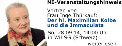 Rund 50 Gläubigen durften wir die MI mit folgenden Inhaltspunkten etwas näher bringen: hl. Maximilian Kolbe, Entstehung und Entwicklung der MI, die MI nach dem Konzil, Übereinstimmung der MI mit Fatima und der Apokalypse, Wesen und Formen des Apostolates, die Immaculata als Heerführerin der MI.