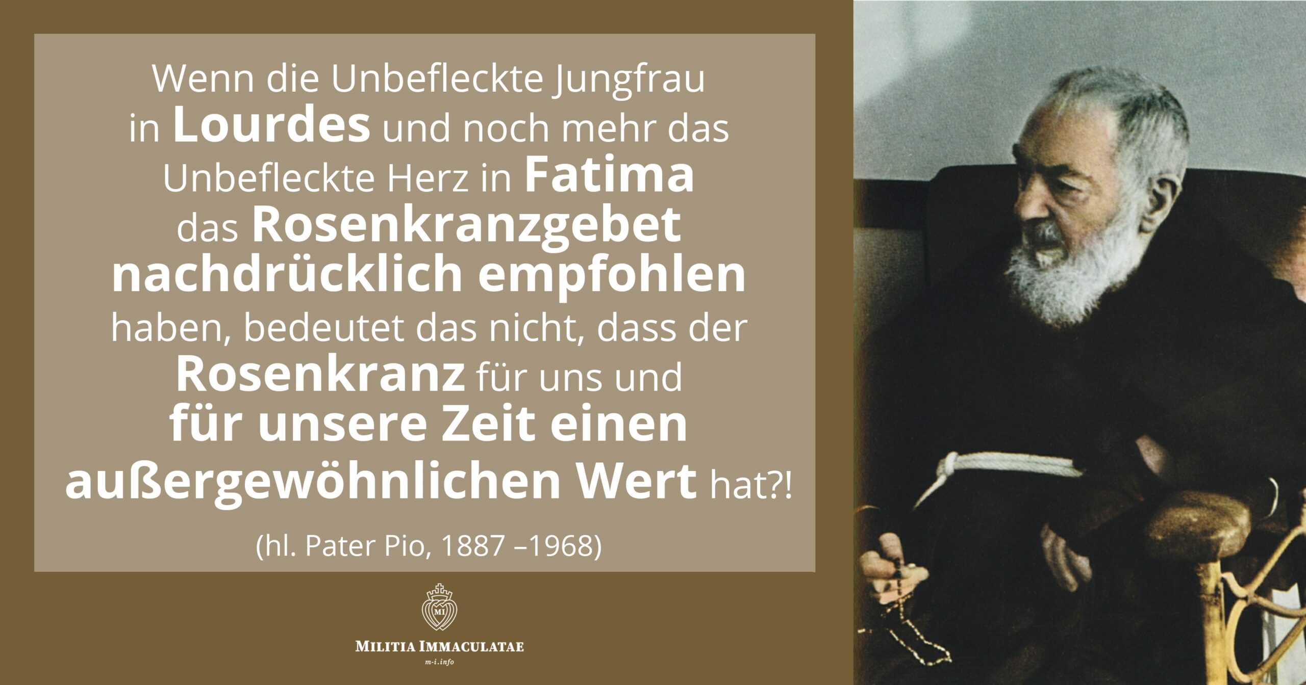 Am Ende seines Lebens, als es darum ging seinen letzten Willen zu bekunden, sagte Pater Pio: „Liebt die Muttergottes und macht, dass man sie liebt. Betet allezeit den Rosenkranz!“ – Pater Pio