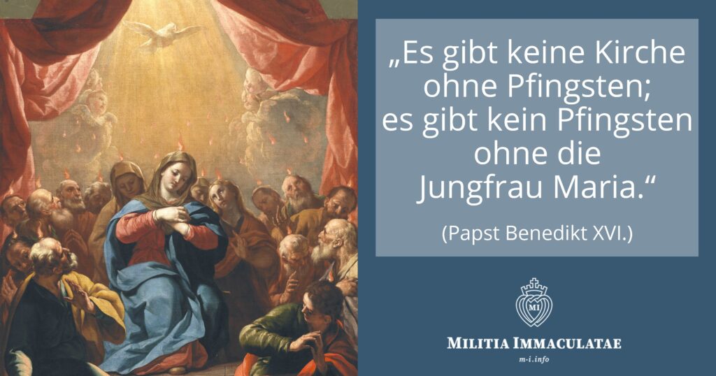 Als nun der hohe Pfingsttag angebrochen war, so berichtet das heilige Evangelium, entstand plötzlich vom Himmel her ein Brausen gleich dem Brausen eines heftigen Sturmes und erfüllte das ganze Haus, in dem die Apostel waren. Es erschienen zerteilte Zungen wie Feuerflammen und ließen sich auf jeden einzelnen nieder. Sie wurden erfüllt vom Heiligen Geiste und begannen in verschiedenen Sprachen zu sprechen, wie der Geist es ihnen eingab. Unendlicher Jubel erfüllte in dieser Stunde alle Herzen. Wie groß war erst die Freude, welche das Herz der heiligsten Mutter durchdrang! Reicher als die anderen überfluteten ihre gnadenvolle Seele die Ströme des Lichtes, der Kraft und des Trostes und klarer als alle erkannte sie in diesen Flammen ein Zeichen der göttlichen Macht ihres Sohnes.