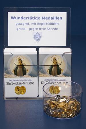 Um die Gläubigen für das Apostolat mit der Wundertätigen Medaille zu animieren, setzt sich die MI dafür ein, dass in möglichst vielen Kapellen/Kirchen Medaillen gegen freie Spende angeboten werden. Die Medaillen, welche bei uns bezogen werden können, sind jeweils bereits gesegnet und daher unverkäuflich. Um den Verantwortlichen vor Ort die Arbeit zu erleichtern, bieten wir ein Set für die Schriftenstände an, bestehend aus: – Einem Prospektspender, welcher ca. 120 Flyer zur Medaille fasst. Dieser ist bereits mit einem Aufkleber versehen, der die nötigen Informationen enthält. – Einer transparenten Acryldose, welche die Medaillen auf ansprechende Weise zeigt. Kosten für das Set (ohne Inhalt): 7- |