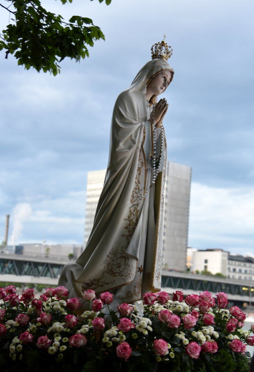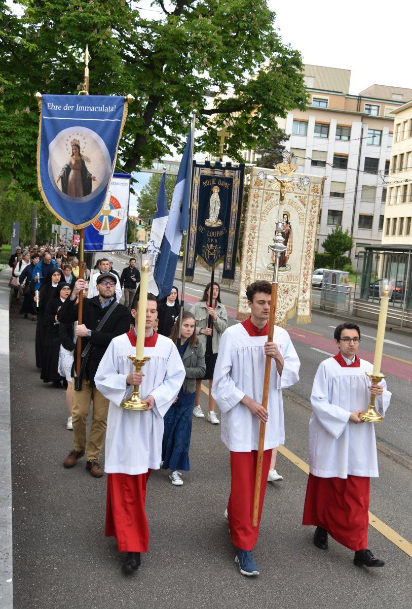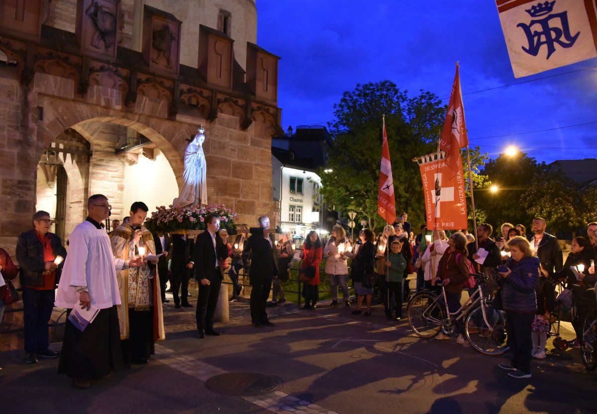 Am Freitag, 12.5.2023, fand am Abend eine Fatima-Lichter-Prozession durch Basel statt mit Fahnen, Blasmusik, Gesang und Gebet. An der Prozession nahmen gegen 330 Personen teil, darunter auch viele junge Menschen. Anlass dazu war, dass am 13. Mai 1917 die Gottesmutter Maria im portugiesischen Fatima drei Hirtenkindern erstmalig erschienen war, um den Menschen als himmlische Mutter zu Hilfe zu kommen und die Welt vor kommenden Krisen und Strafen zu warnen. Bei ihrer letzten Erscheinung in Fatima, am 13. Oktober 1917, waren 70‘000 Menschen Zeugen eines grossen Sonnenwunders. Die Prozession dieses Jahr war gleichzeitig der Abschluss einer nationalen Pilgerfahrt von «Die Schweiz betet».