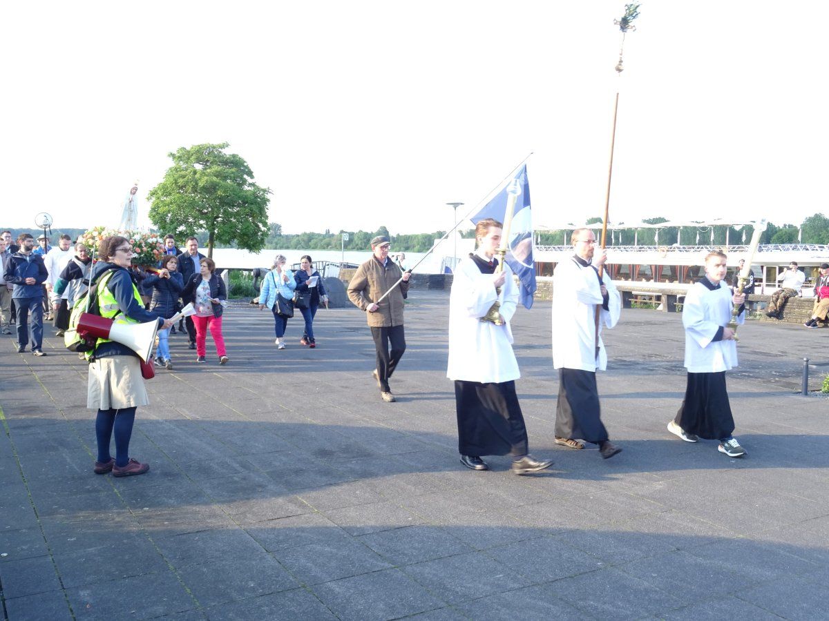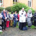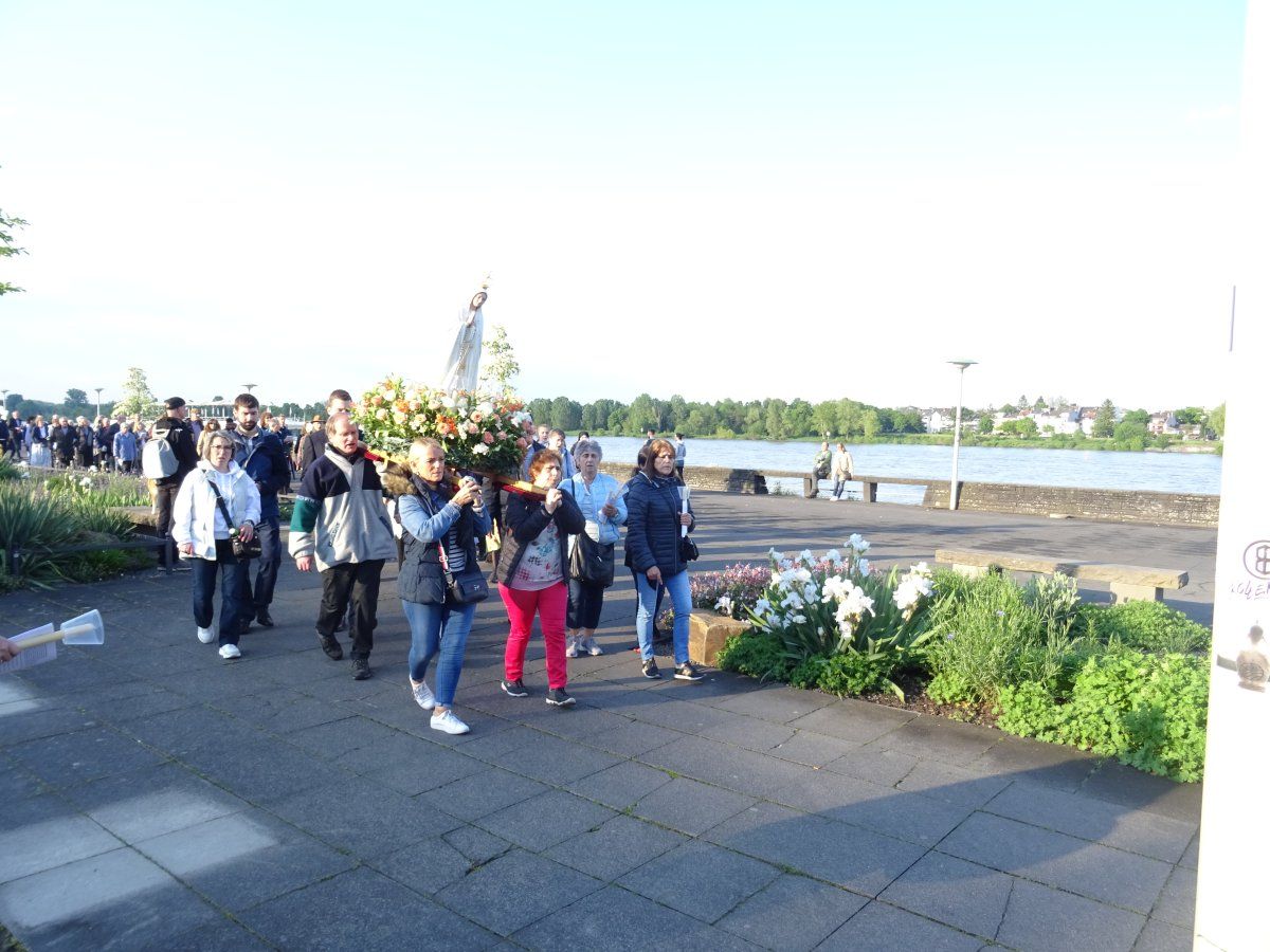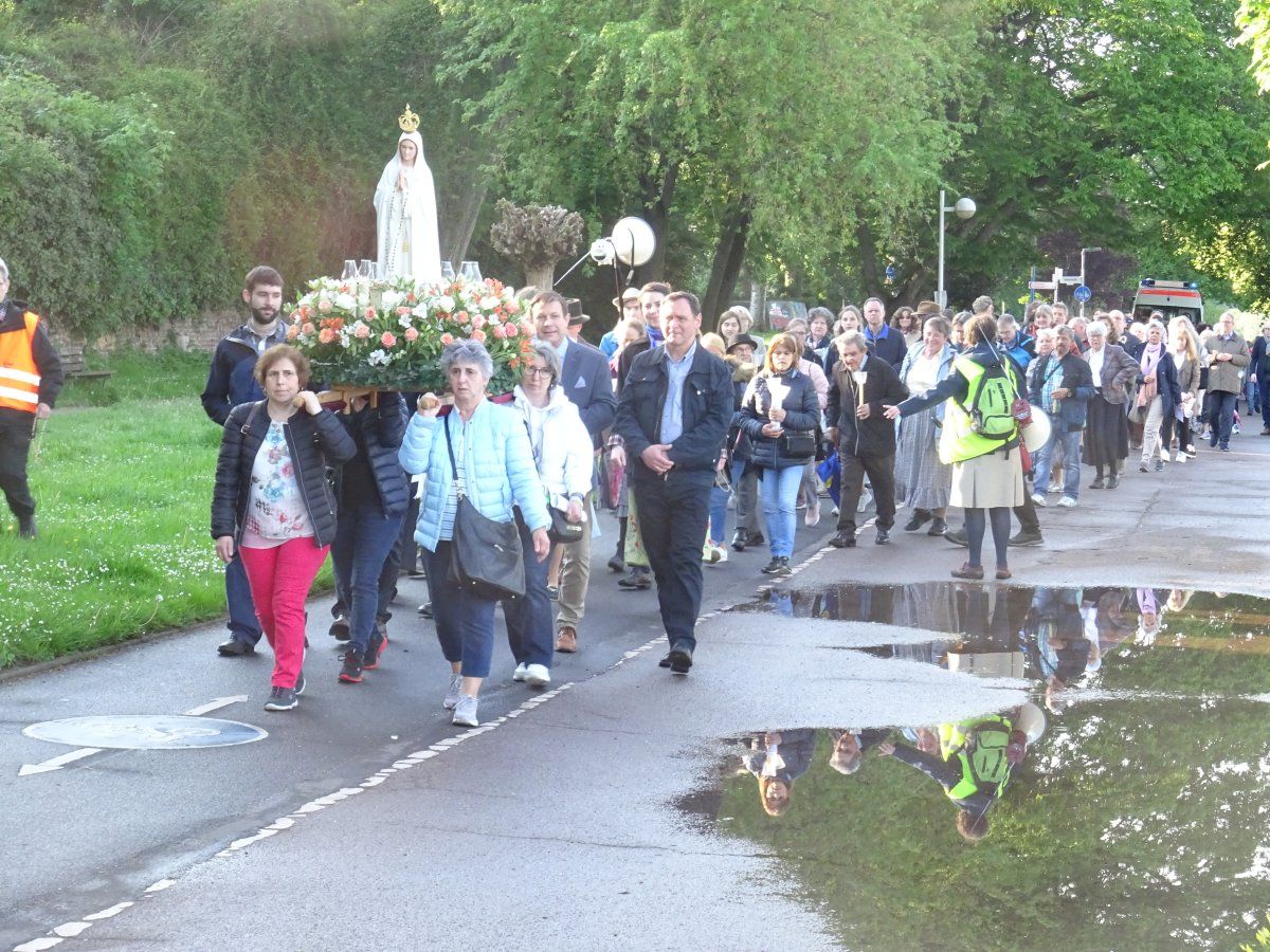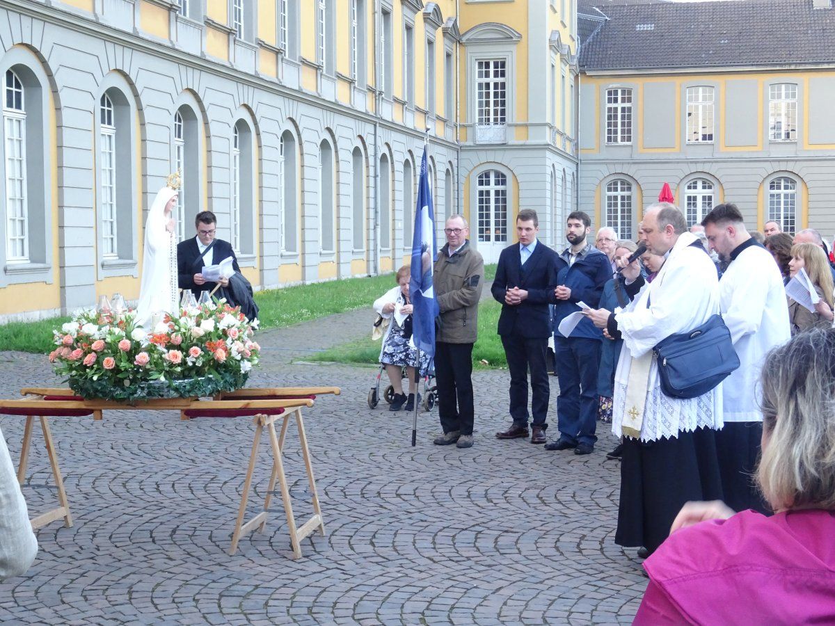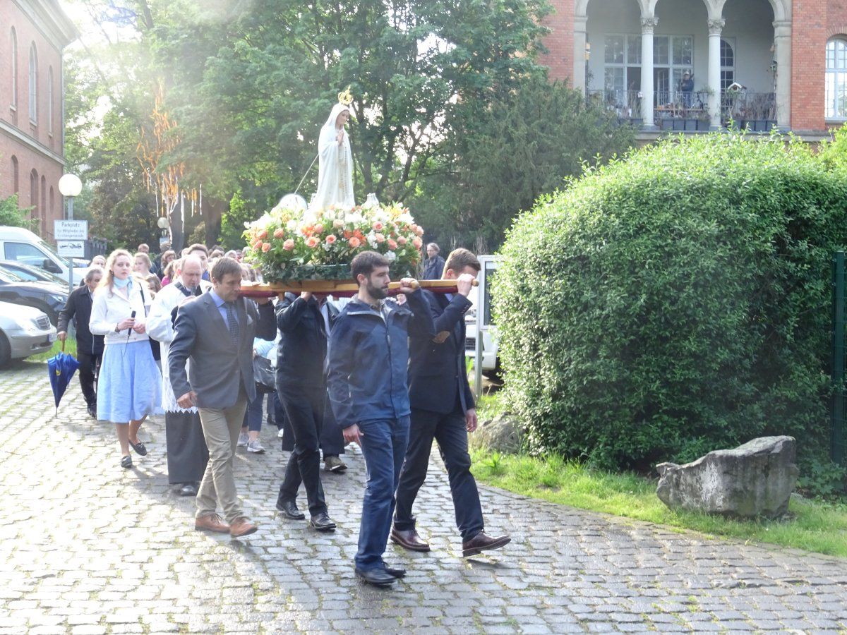 Nach der Ansprache zogen alle Teilnehmer mit dem Kreuz und den Ministranten voran, gefolgt von der MI-Fahne, der reichlich mit vielen Blumen geschmückte Fatima-Statue, der priesterlichen Begleitung durch Pater A. Mählmann, sowie den Sängerinnen/Sänger des Priorates Christkönig.