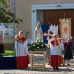 Die Mission begann bereits um 13:30 Uhr mit einem Vortrag von Pater Stehlin über die Offenbarung des Herzens Mariens in Fatima. Dieser war gefolgt von einem ersten Höhepunkt des Wochenendes, einer fast 6 km langen Marien-Prozession durch den Ort und die umliegenden Fluren, bei der ein große Fatimastatue von 4 Männern getragen wurde. Hieran nahmen mehr als 200 Gläubige bei sehr schönen Spätsommerwetter teil. Es waren auch, vielleicht aufgrund der Bewerbung im Vorfeld, sicher aufgrund der reichen Gnade, die Maria alle zu schenken bereit ist, einige neue Gesichter anwesend. Auf dem Prozessionsweg lag auch eine kleine Kapelle, die dem heiligen Ulrich geweiht ist. An dieser „Ulrichs-Kapelle“ wurde kurz angehalten und gebetet und so einem großen Heiligen unserer deutschen Heimat gebührende Reverenz erwiesen. In die Prozession eingebettet, war eine rund 30-minütige Kundgebung mit Ansprache zum Thema „Die Immaculata unsere Rettung“ auf dem Rathausplatz.
