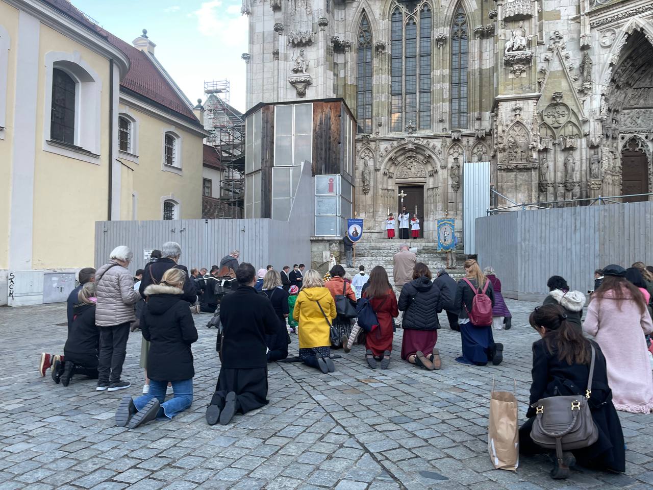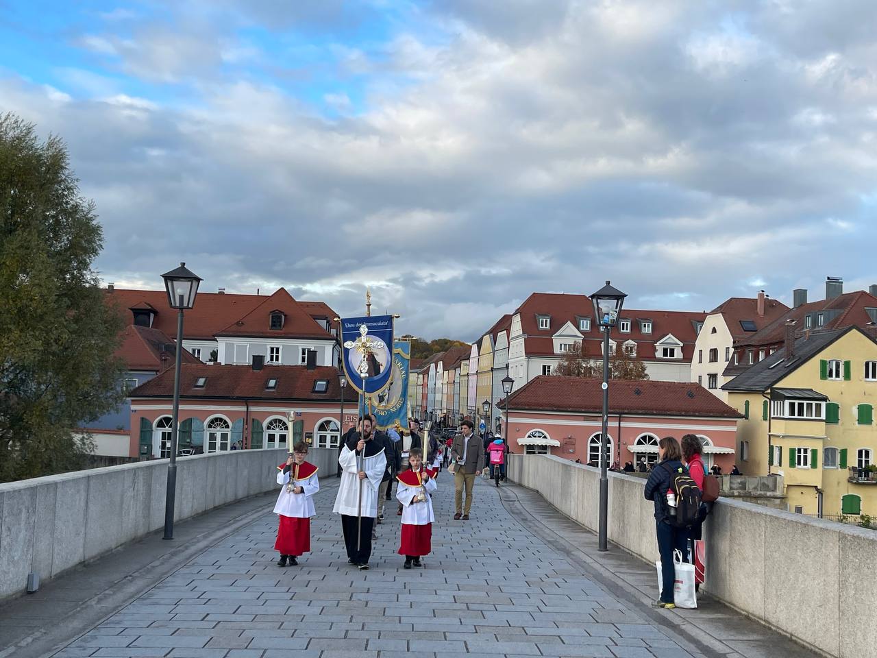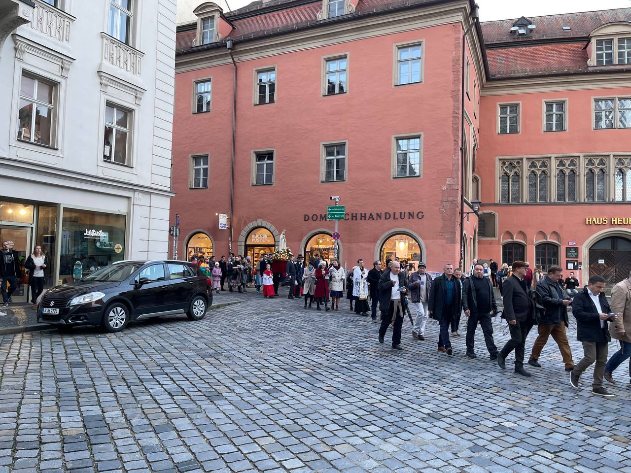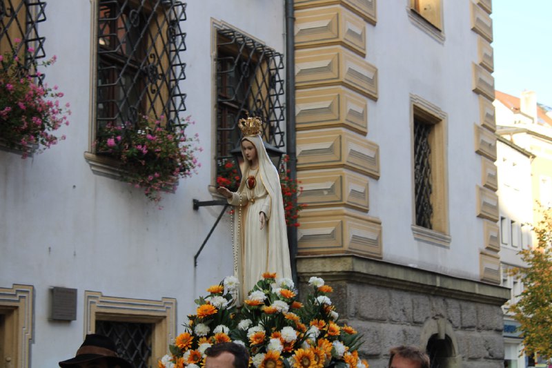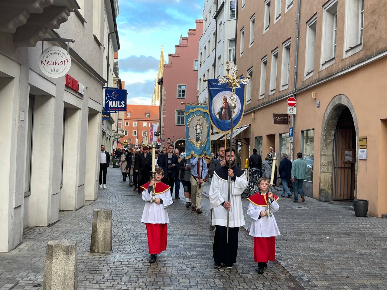 Am 15. Oktober folgten etwa 70 Gläubige der Einladung der KJB und MI aus Zaitzkofen zur Rosenkranzprozession durch die Regensburger Innenstadt, um gemeinsam die Patrona Bavariae zu ehren und durch sie von ihrem Sohn den Triumph ihres Unbefleckten Herzens zu erflehen. Zum Abschluss hielt P. Roder eine Ansprache auf dem Domplatz, in welcher er die Macht des Rosenkranzgebetes mit den Worten Sr. Lucias in Erinnerung rief: Es gibt kein Problem, egal wie schwierig es auch sein mag, welches wir nicht durch das Gebet des Rosenkranzes lösen können.
