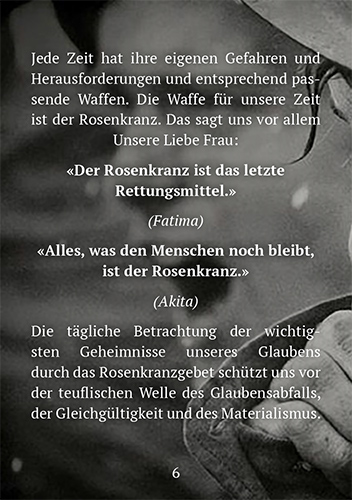 52 Seiten DIN A7 mit dickerem Umschlag; mit vielen Bildern und kurzen, männerspezifischen Gedanken zu jedem Rosenkranzgeheimnis.