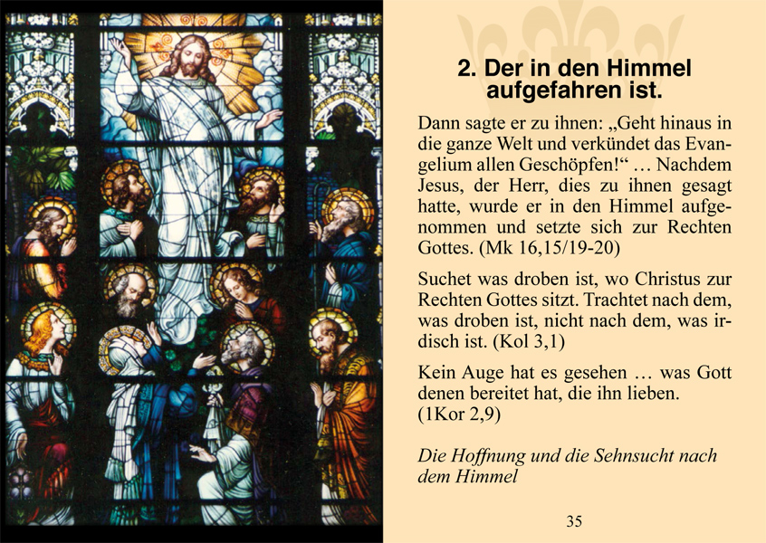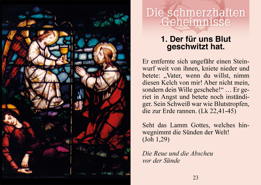 48-seitige Broschüre in der Grösse Din A7. Diese ist dazu gedacht, auch jene Leser, die den Rosenkranz noch nicht kennen, auf den Wert dieses Gebets hinzuweisen und leitet zum Gebet an. Zudem enthält sie die 15 überlieferten Rosenkranzgeheimnisse mit je einem Bild und einem passenden Text aus der Heiligen Schrift.