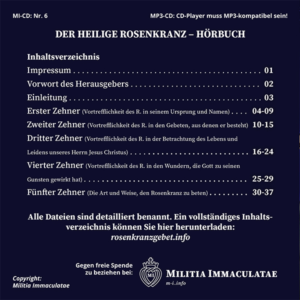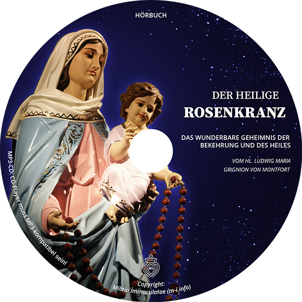 Die Produktion dieses Hörbuches ist Unserer Lieben Frau von Fatima, der Königin des hl. Rosenkranzes, gewidmet, welche uns das tägliche Rosenkranzgebet als Rettungsmittel in diesen letzten Zeiten ans Herz gelegt hat.