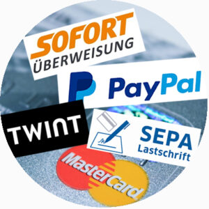 Für EUR: Kreditkarten, Paypal, Sofortüberweisung, SEPA-Lastschrift