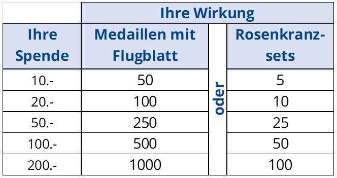 Die MI versendet Medaillen und Rosenkränze in über 50 Länder. Inbesondere die armen Missionsländer unterstützen wir damit kostenlos, da diese nicht in der Lage sind, für die Kosten aufzukommen. Für dieses Jahr rechnen wir mit Unterstützungsbedarf von EUR 8‘000.