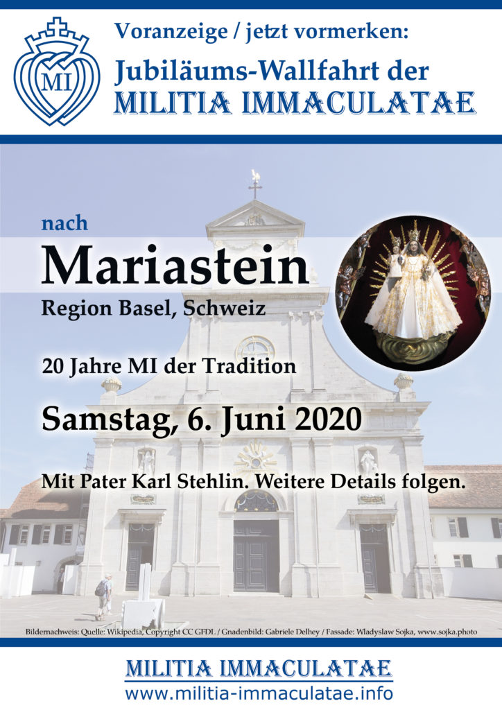 Die Militia Immaculatae der Tradition feiert dieses Jahr ihr 20-jähriges Bestehen. Am Samstag, 6. Juni 2020, wird deshalb eine Wallfahrt nach Mariastein (Region Basel, Schweiz) organisiert. Der internationale Direktor, Pater Karl Stehlin, wird voraussichtlich ebenfalls daran teilnehmen. Weitere Details folgen. Bitte reservieren Sie sich schon jetzt das Datum.