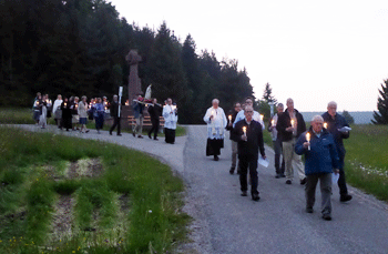 Diesen Beispielen der öffentlichen Huldigung ULF von Fatima durften wir am Samstag, der Pfingstvigil, unseren kleinen Beitrag hinzufügen. In der Dämmerung trugen wir bei Kerzenschein, den Rosenkranz betend und das Fatimalied singend, Unsere Liebe Frau durch die stille Abendlandschaft.