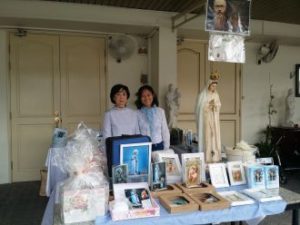 The morning started sluggishly after the 8a.m. Mass, but became more vibrant after the 10a.m. Service. Items popular with parishioners were the MI’s Fatima 100th Anniversary luggage tags, Our Lady’s bookmarks and the 2 books, “What Jesus owes to His Mother” and “Meditations on the mysteries of the Rosary,” recommended by Fr Wailliez in his homilies. There were also a few generous donations.