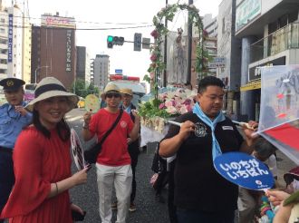 Already before the start, the Statue which was beautifully adorned by roses and lilies, has arrived at the gate of the Church, waiting for the pro-lifers. With big and beautiful smiles, everyone marched in the modern city of Tokyo under Summer Sunshine. It seems that Our Lady of Fatima was the center of attraction for everybody, even for the side-walkers. The SSPX parishiors walked praying the Holy Rosary around Our Lady for 3 km until the Hibiya Parch near the National Diet building, perimeter of the Imperial Palace. The organizer said that this year the number of participants doubled from that of last year. Some people came from distant places. Even a representative from a Pro Life multi-denominational Christian of Taiwan flew in for this purpose.