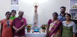 The pilgrim statue of Our Lady of Fatima was taken to the houses of our faithful in Chennai; there was a great veneration of Our Lady in each house as they welcomed Our Lady in a display of their love with wonderful floral arrangements as thrones made fit for the Queen. At each house we prayed the Rosary, the Litany was chanted and we sang hymns in honour of our Blessed Mother. Miraculous Medals and Rosaries were distributed to all those who attended and a short narrative about the apostolate of the M.I. was given to those who visited. We are truly thankful to our Blessed Mother for giving us the blessing of honouring her in this manner.
