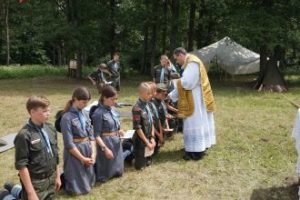 The ceremony took place during a Scout Camp in Bludzie Małe (near Suwałki in the east-north of Poland). Before the ceremony Father Stehlin held a conference about the M.I. and St. Maximilian. The young scouts and girl-guides were interested in this information, especially in how the Knights of the Immaculata came into being.