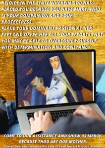 The heart of the sister who had just received such a signal favor and so pleasing a mission was penetrated, filled with gratitude and warm sentiments for Mary Most Holy! O my soul, search in your heart for those sentiments, and be dissolved in gratitude for Mary of Good Success, our Advocate and Protectress. Let me venerate her Image with the most tender gratitude and the vehement desire of corresponding to such singular benefits by leading a life that is holy, obedient, and observant of all the duties of my state of life.