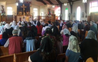 After morning Mass, Knights of the Immaculata at St Anthony’s in Wanganui, New Zealand, renewing their consecration before the Blessed Sacrament.