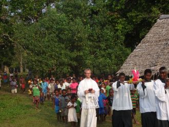 When Father asked the catechist to intone a hymn in honour of the Holy Ghost, it seemed that the roof of the church was going to blow away! All their hearts and their love were begging Heaven to inspire them. And no less than 45 poor men and women from the very isolated village of Vunapisu came to kneel down to receive the Miraculous Medal. The renewal of the baptismal vows was made in French, the language of the Catholics on Vanuatu islands; the blessing of the medals was in Latin and the act of consecration in Bislama!