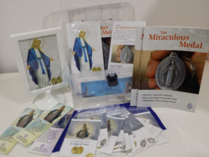On the photo is what the ladies carry in their presentation kit. For subsequent presentations there will also be a standup banner of Our Lady of the Miraculous Medal.