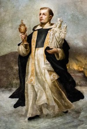 While Saint Hyacinth was at Kiev the Tartars sacked the town, but it was only as he finished Mass that the Saint heard of the danger. Without waiting to unvest, he took the ciborium in his hands, and was leaving the church. Then occurred the most famous of his countless prodigies. As he passed by a statue of Mary a voice said: Hyacinth, My son, why do you leave Me behind? Take Me with you… The statue was of heavy alabaster, but when Hyacinth took it in his arms it was light as a reed. With the Blessed Sacrament and the statue he walked to the Dnieper river, and crossed dry-shod over the surface of the waters to the far bank.