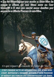 Par la réparation, nous nous tenons à ses côtés et protégeons son honneur de l’hostilité ennemie. Plus le diable et ses forces L’insultent, plus nous devons L’entourer d’amour et de fidélité. Chaque acte de réparation, d’un seul coup, repousse l’ennemi, affaiblit son pouvoir et réduit ses forces en convertissant les âmes et en les engageant dans l’armée de Notre-Dame tels des chevaliers qui comprennent et défendent l’honneur de leur Mère.